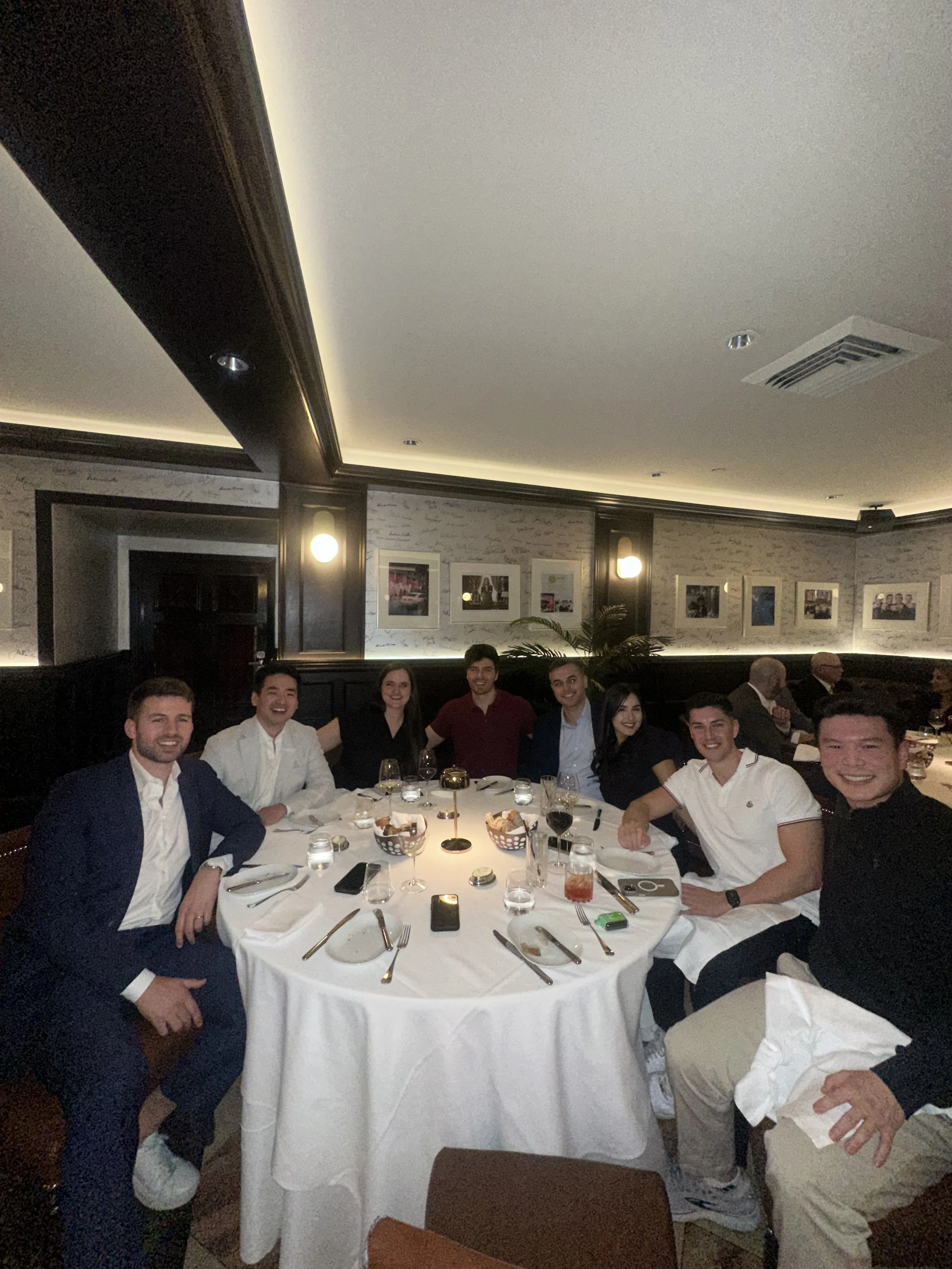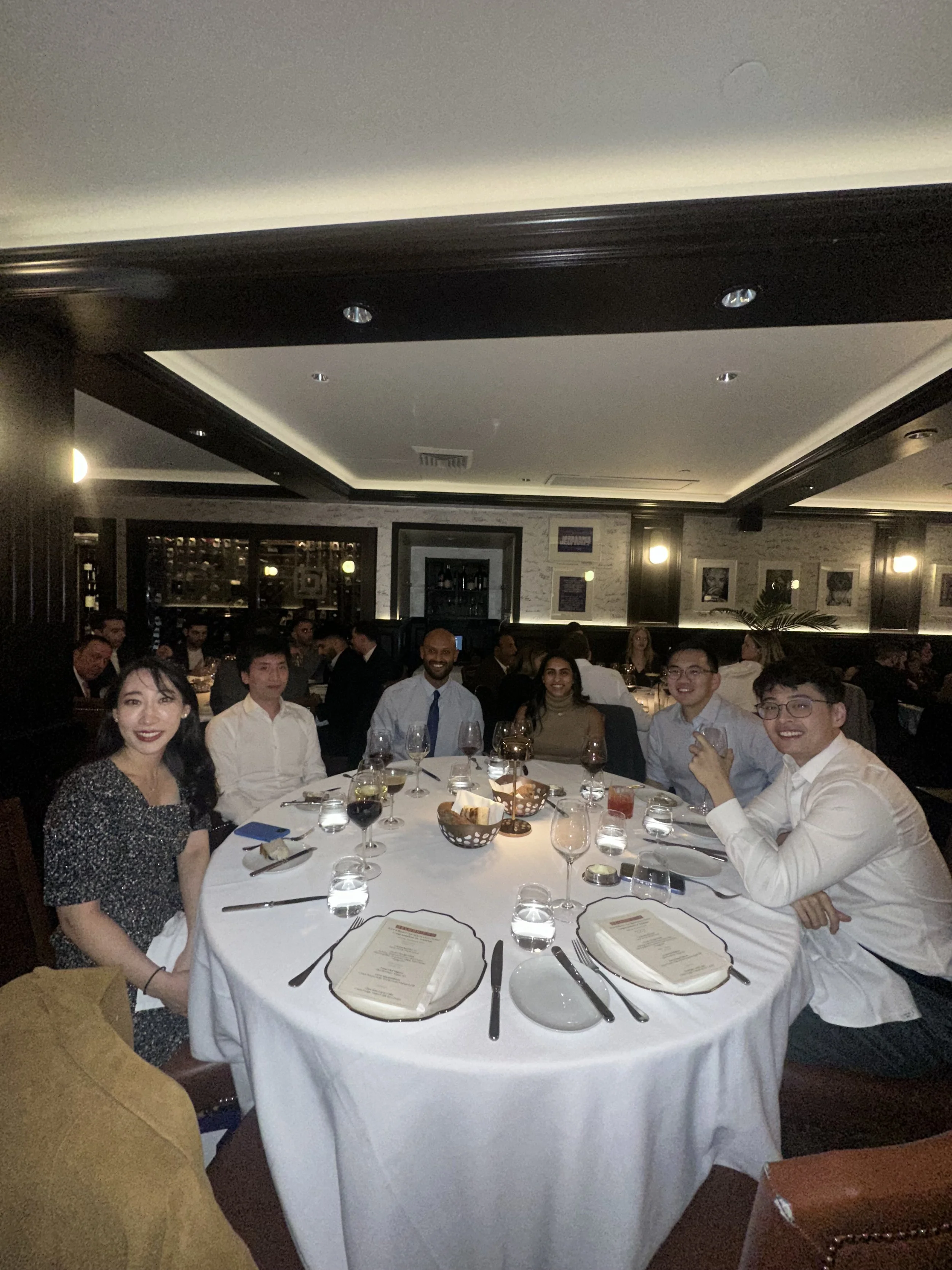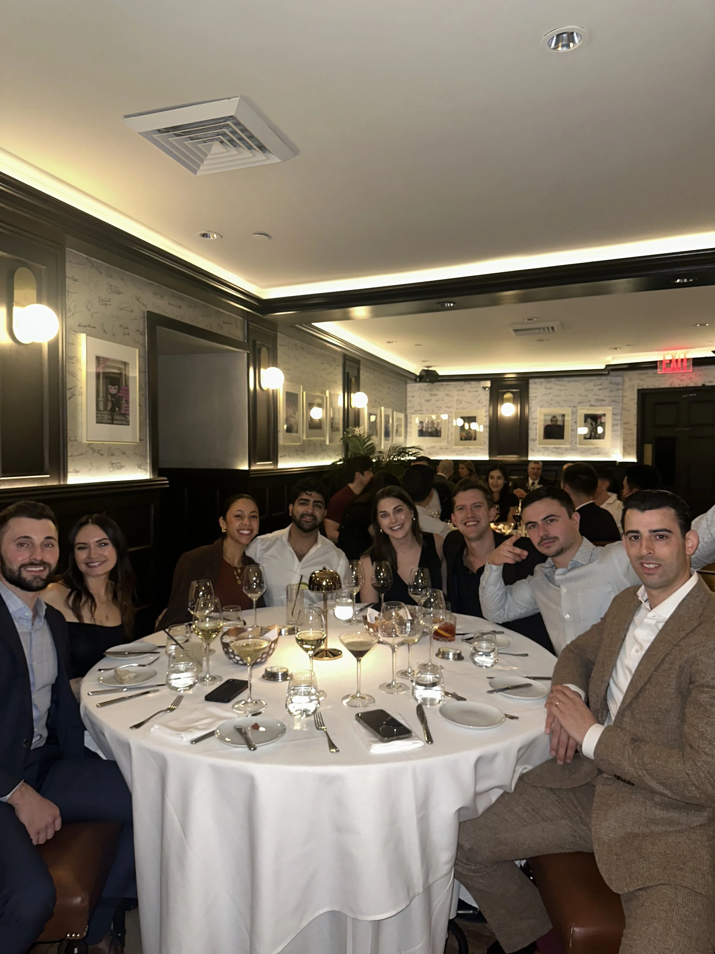 A group of eight young adults sitting around a round dining table at a restaurant, smiling and enjoying a meal, with wine glasses, water, and plates on the table.