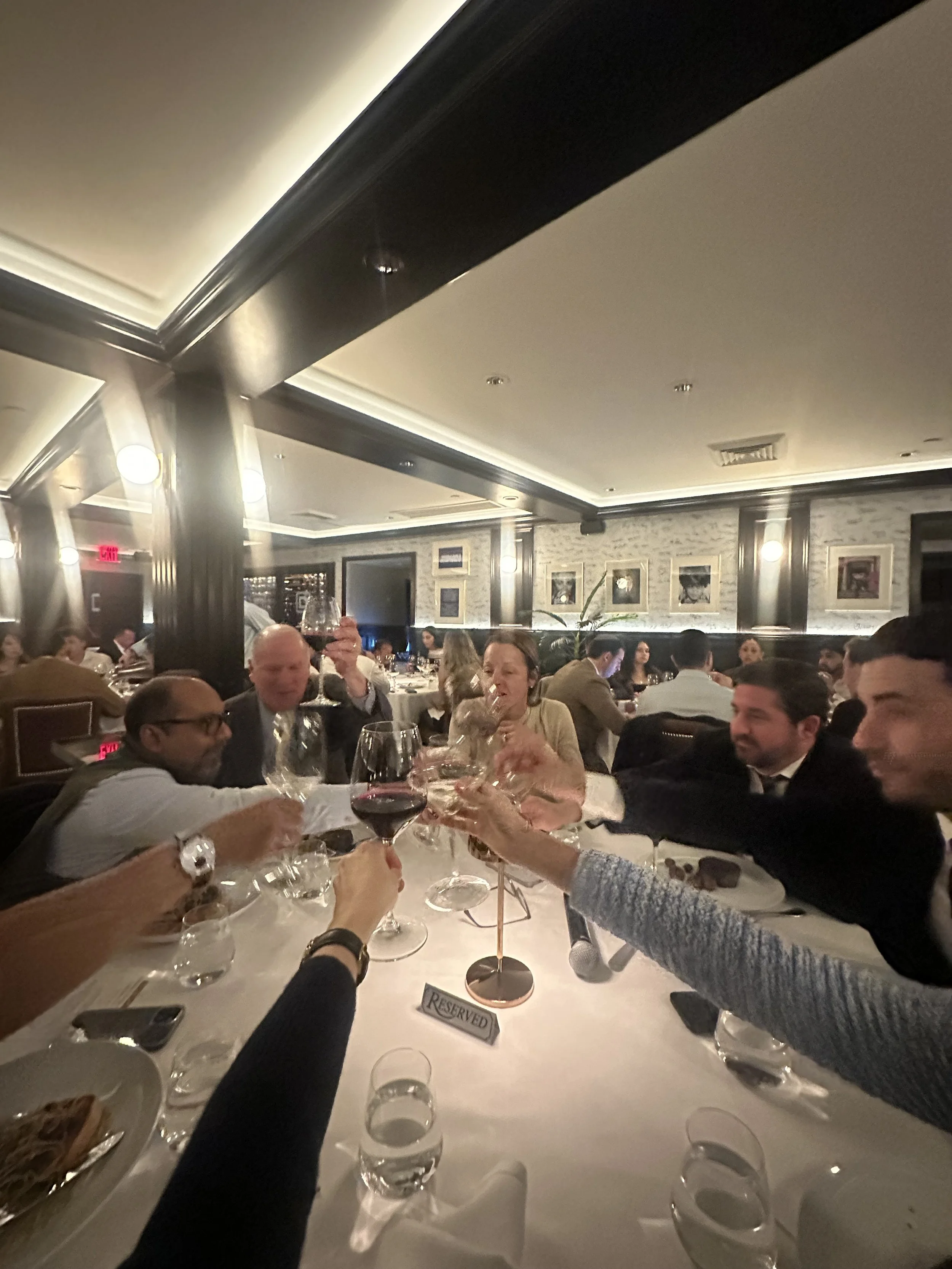 A group of people at a restaurant table raising glasses for a toast, with a 'Reserved' sign on the table, surrounded by wine glasses, plates, and a lively dining atmosphere.