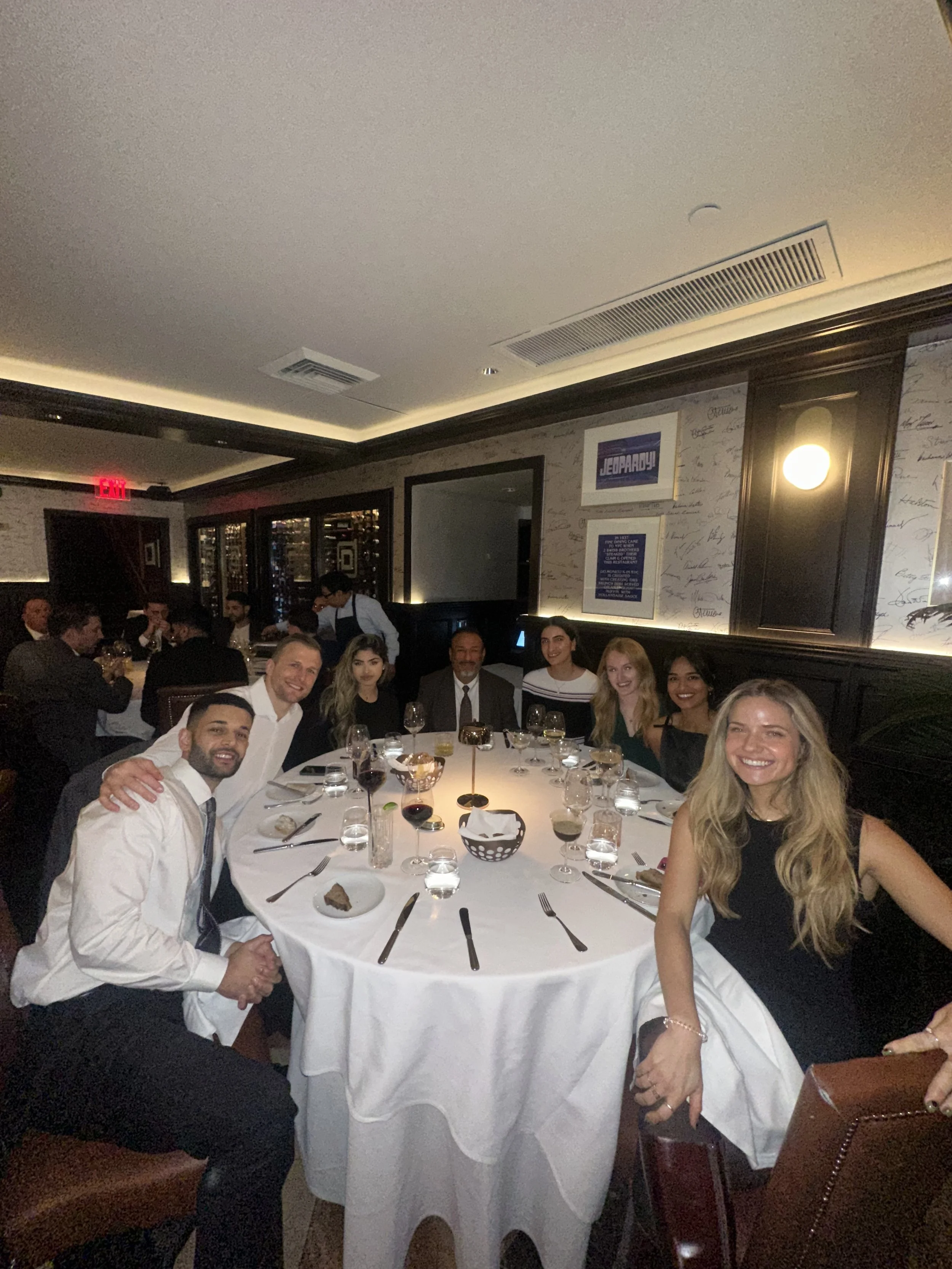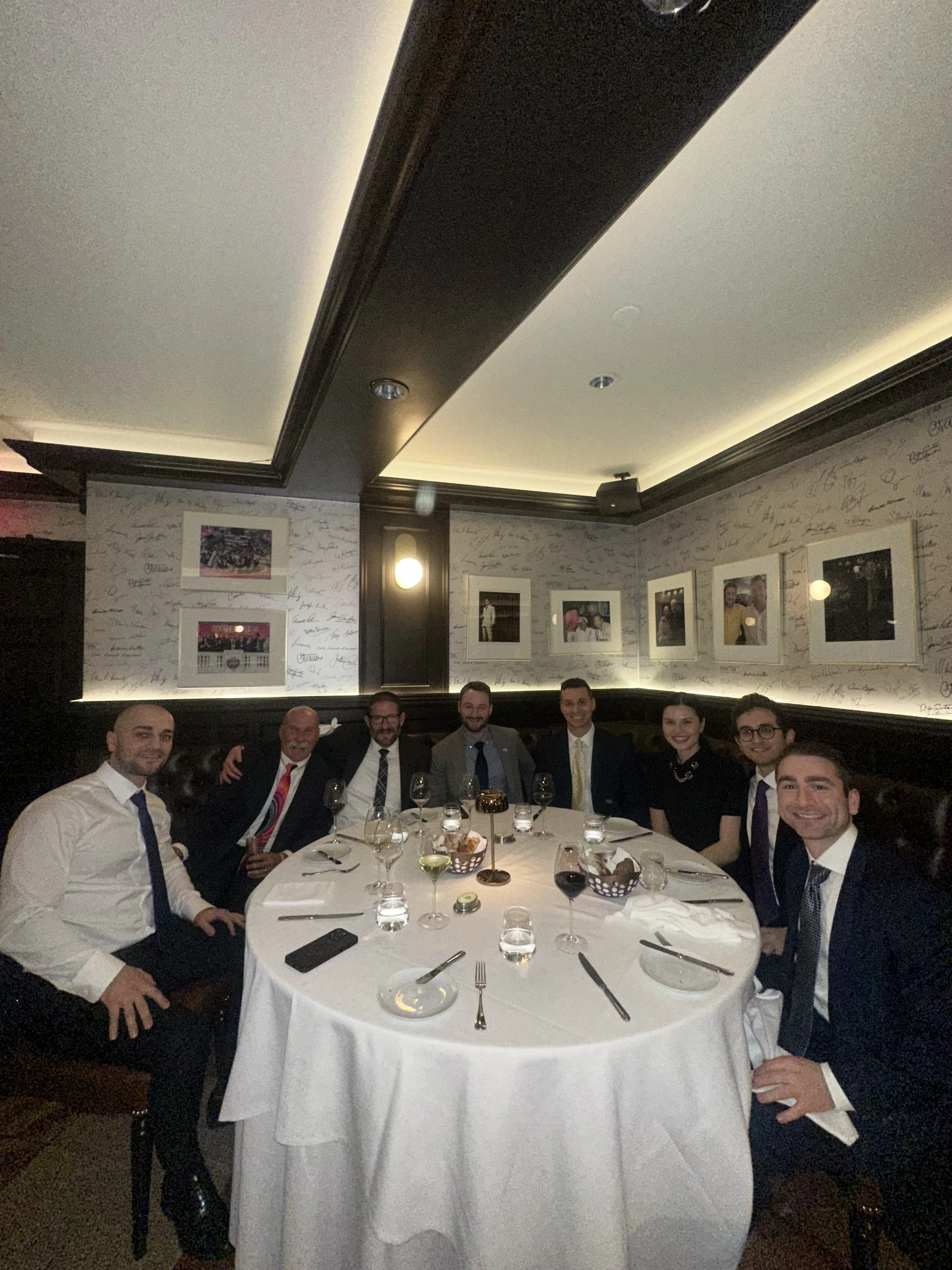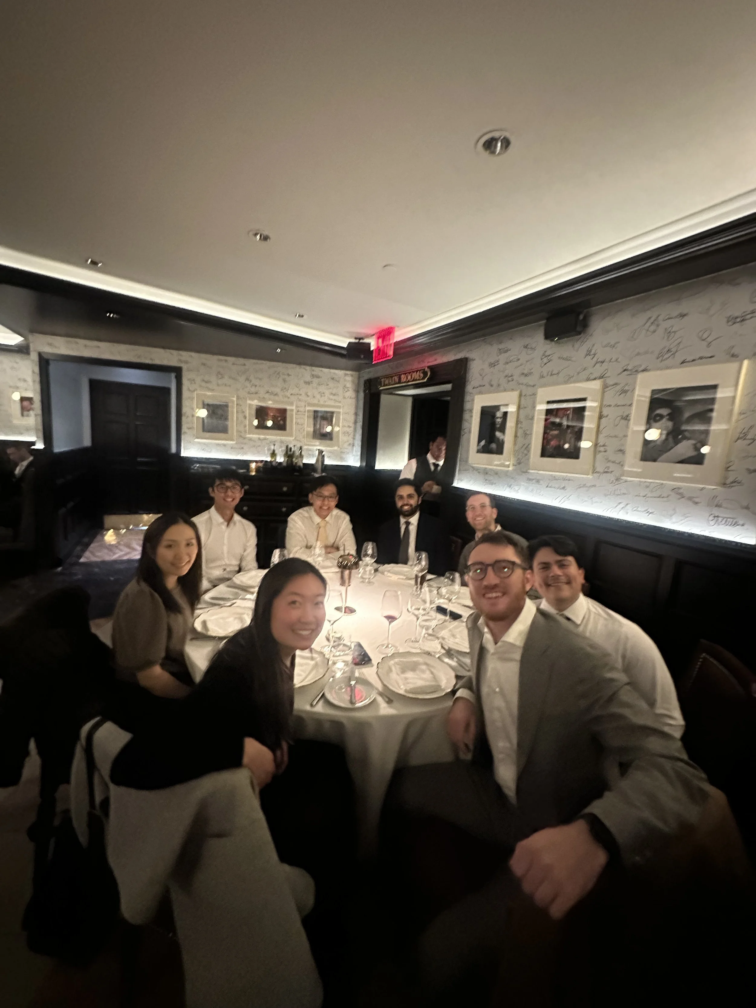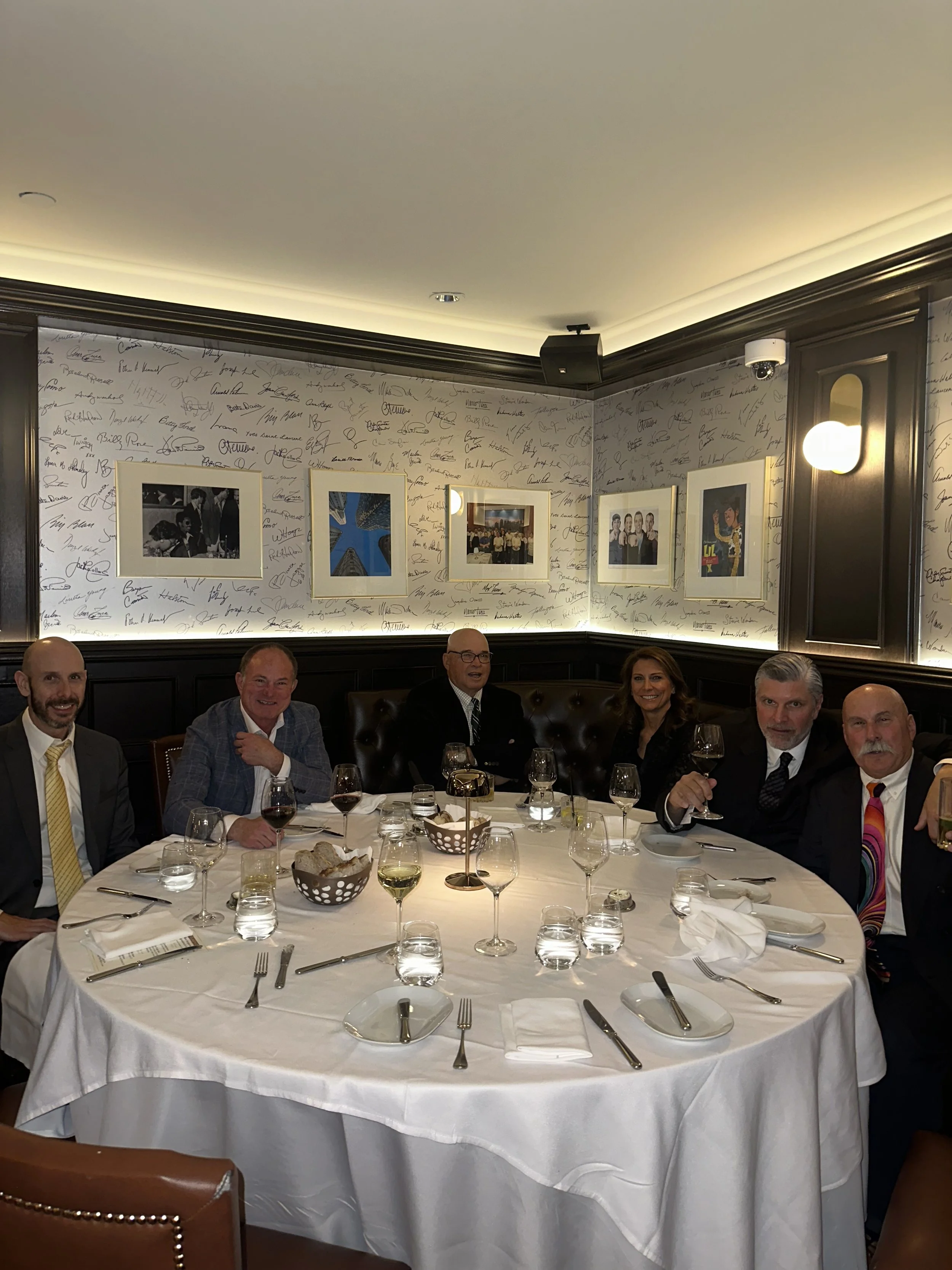 People sitting around a round dining table at a restaurant, with glasses of wine and water, and a wall with framed photos and signatures behind them.
