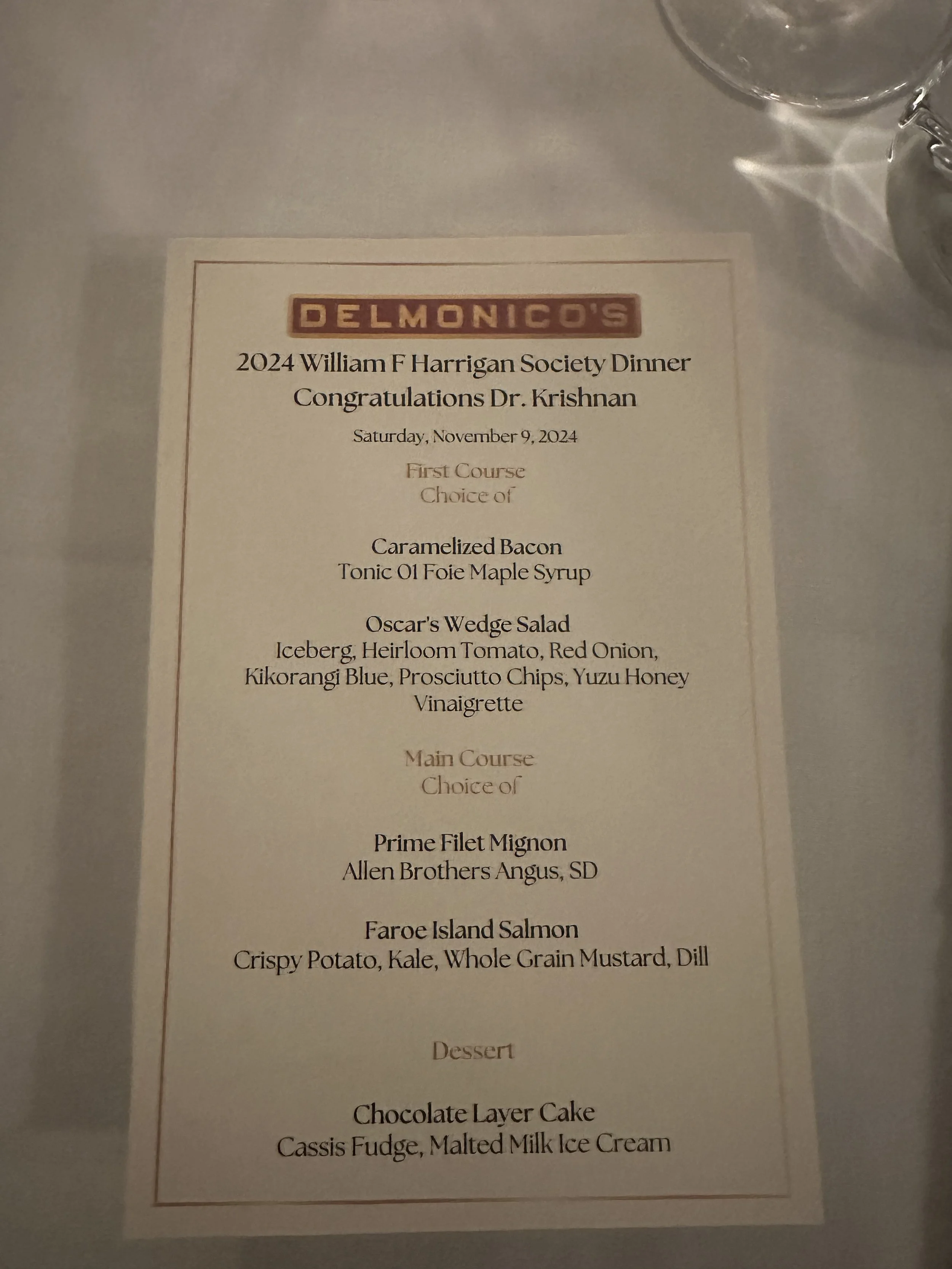 Dinner menu for Delmonico's at the 2024 William F Harrigan Society Dinner, including first courses of caramelized bacon and Oscar's wedge salad, main courses of prime filet mignon and Faroe Island salmon, and dessert of chocolate layer cake.
