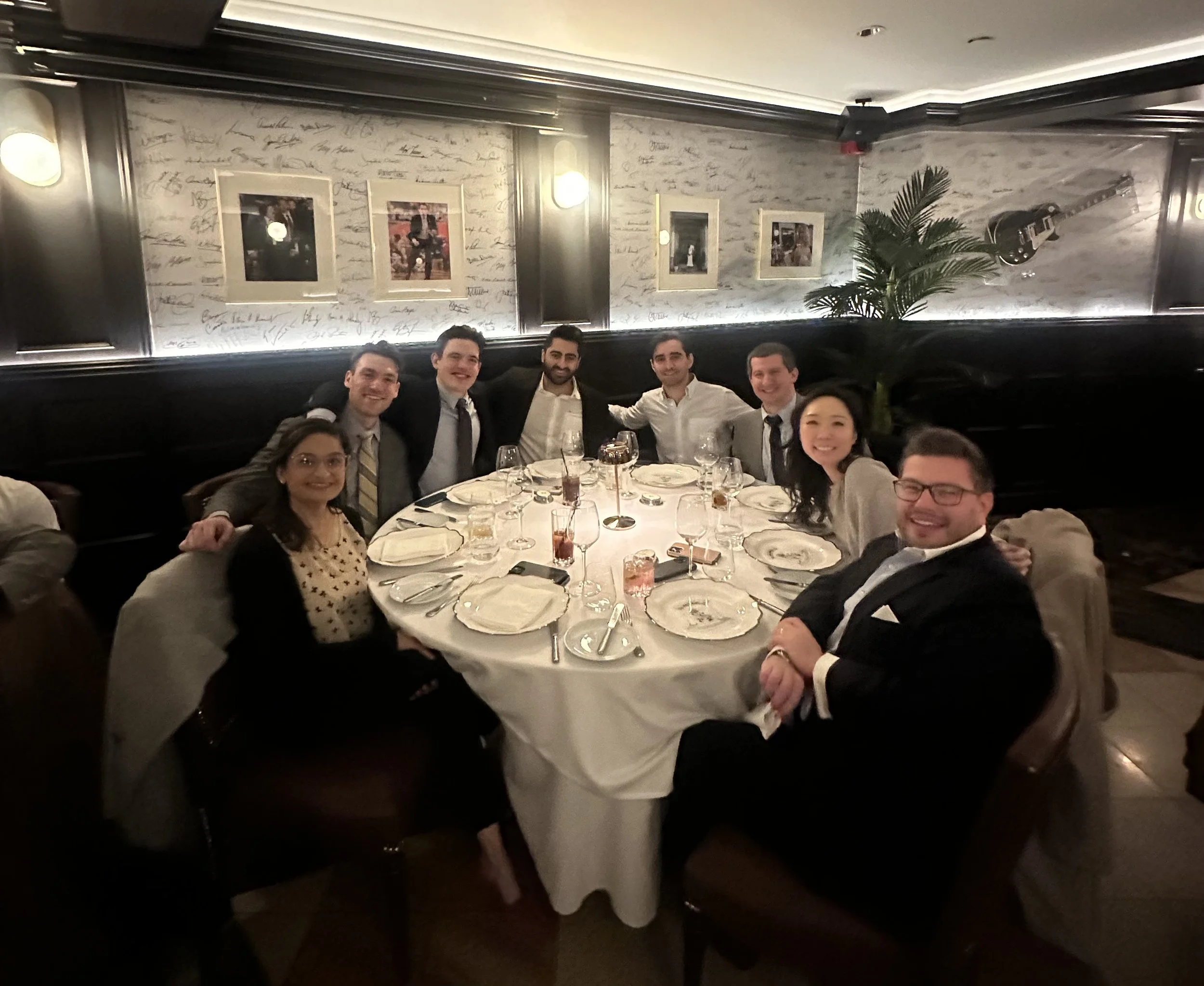 Group of nine people sitting around a round table in a restaurant, dressed in formal attire, smiling at the camera.