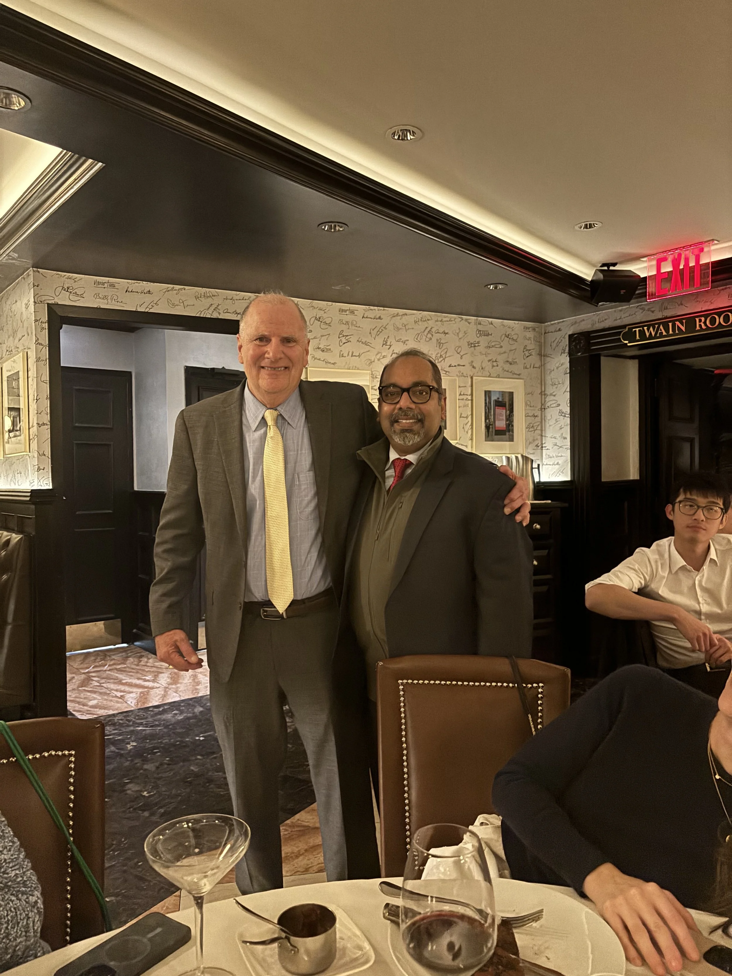 Two men in suits standing and posing for a photo in a restaurant, with one man having his arm around the other, surrounded by dining tables and other people.