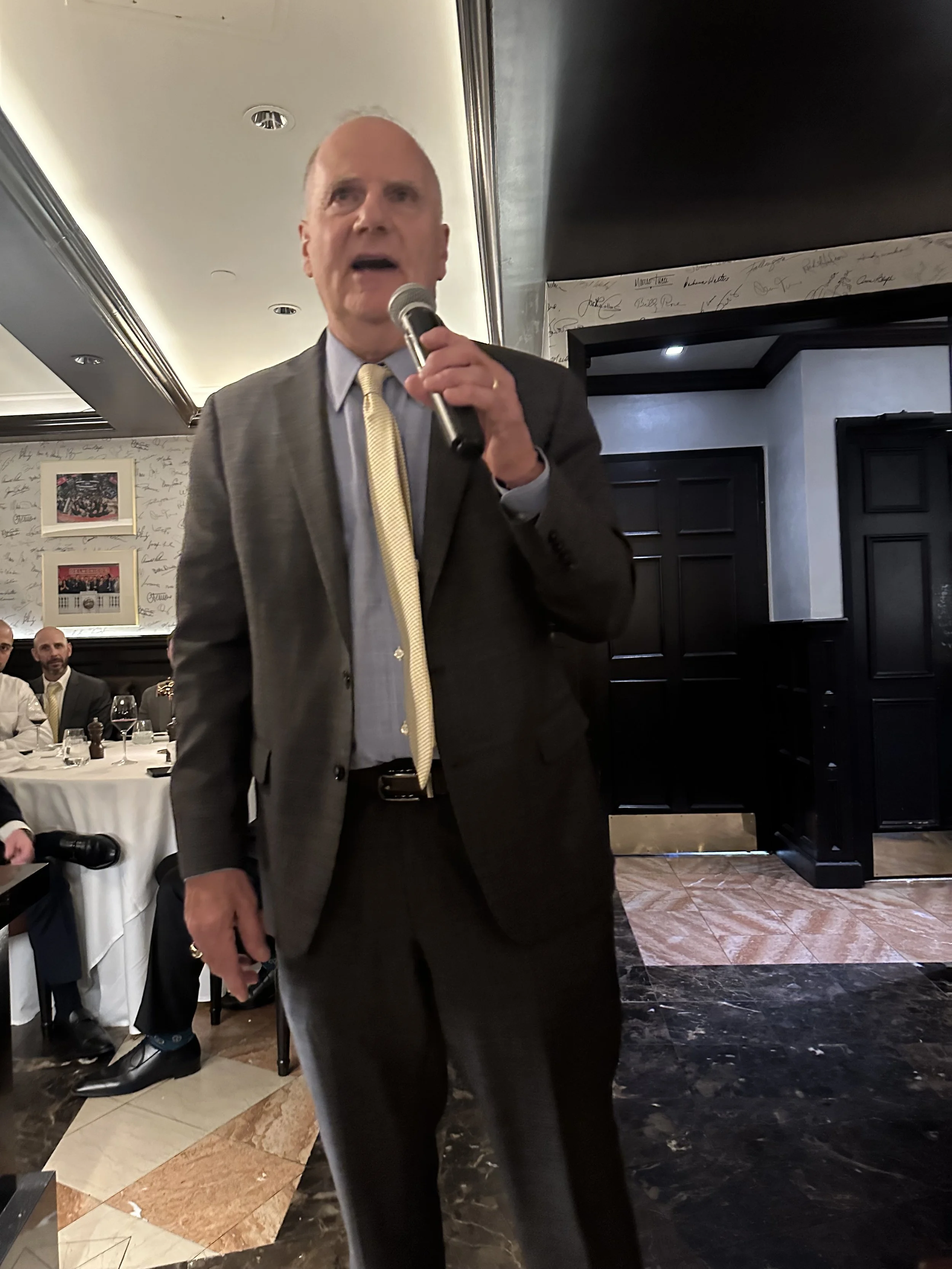 A man in a gray suit and yellow tie speaking into a microphone at a formal event, with guests seated at tables in the background.