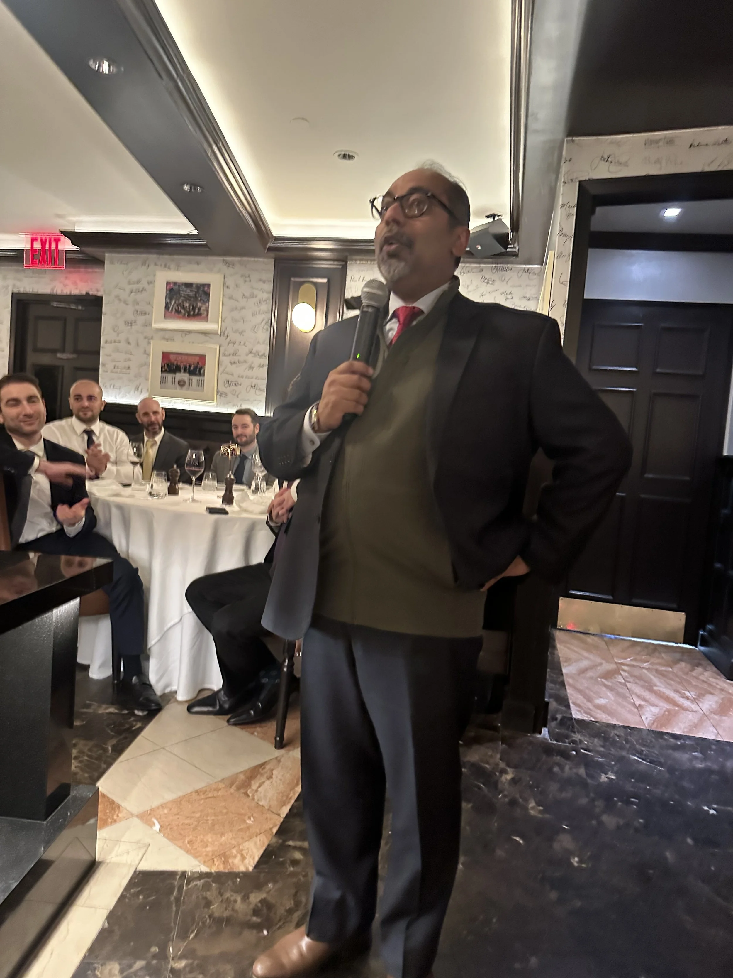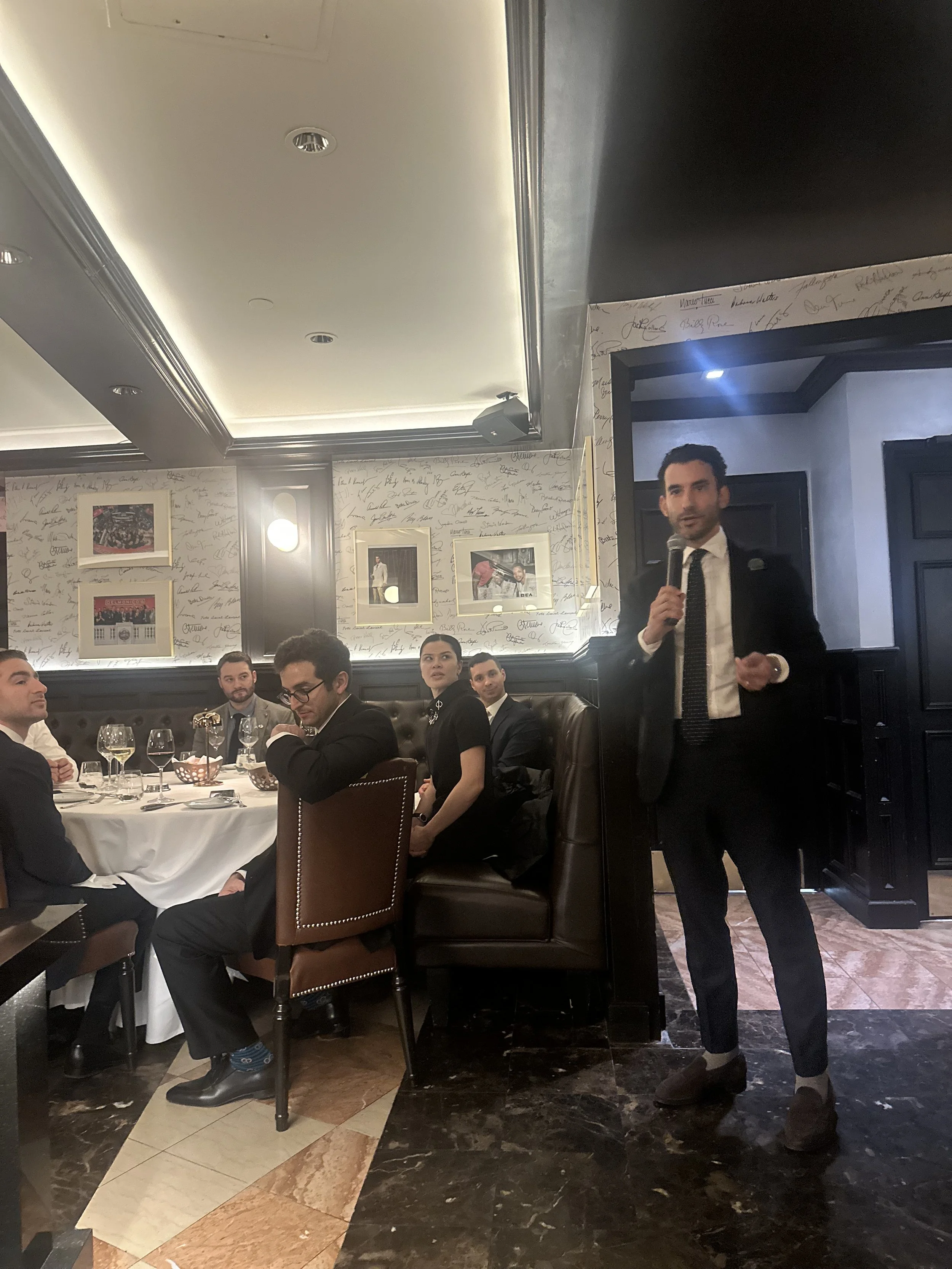 Man in a black suit standing and speaking into a microphone at a formal dinner event with seated guests around a round table in a restaurant.