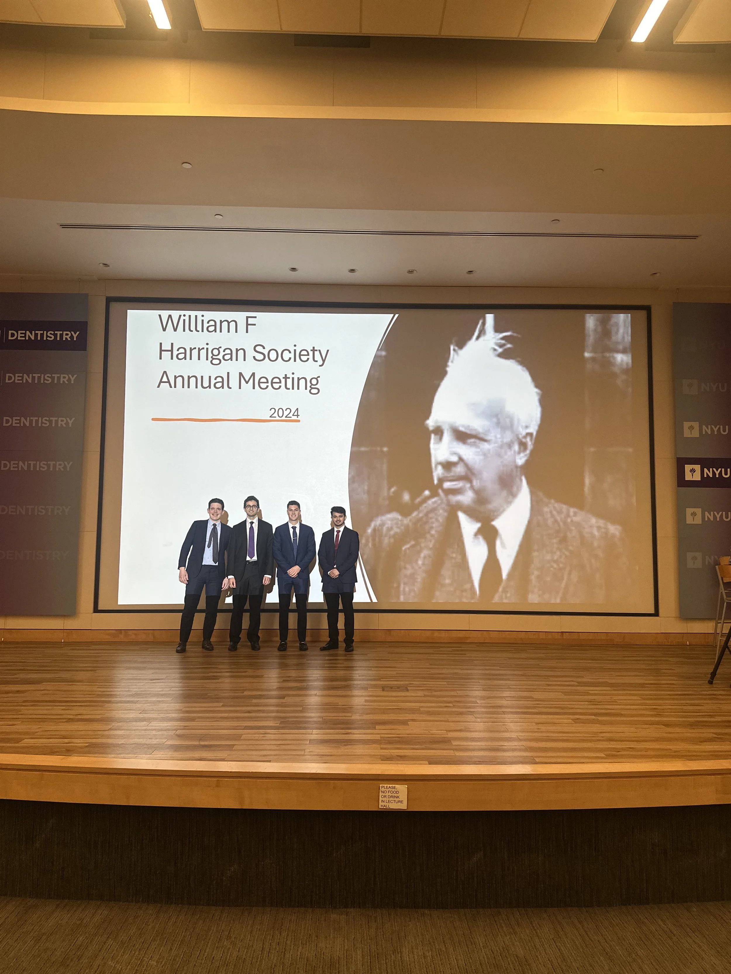Four young men in suits standing on a wooden stage in front of a large screen displaying a presentation slide. The slide reads 'William F Harrigan Society Annual Meeting 2024' and features a black and white portrait of William F Harrigan.