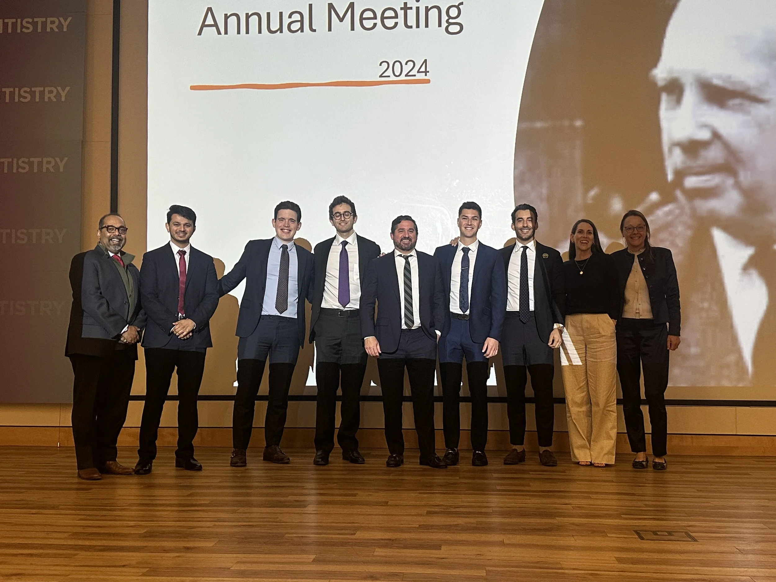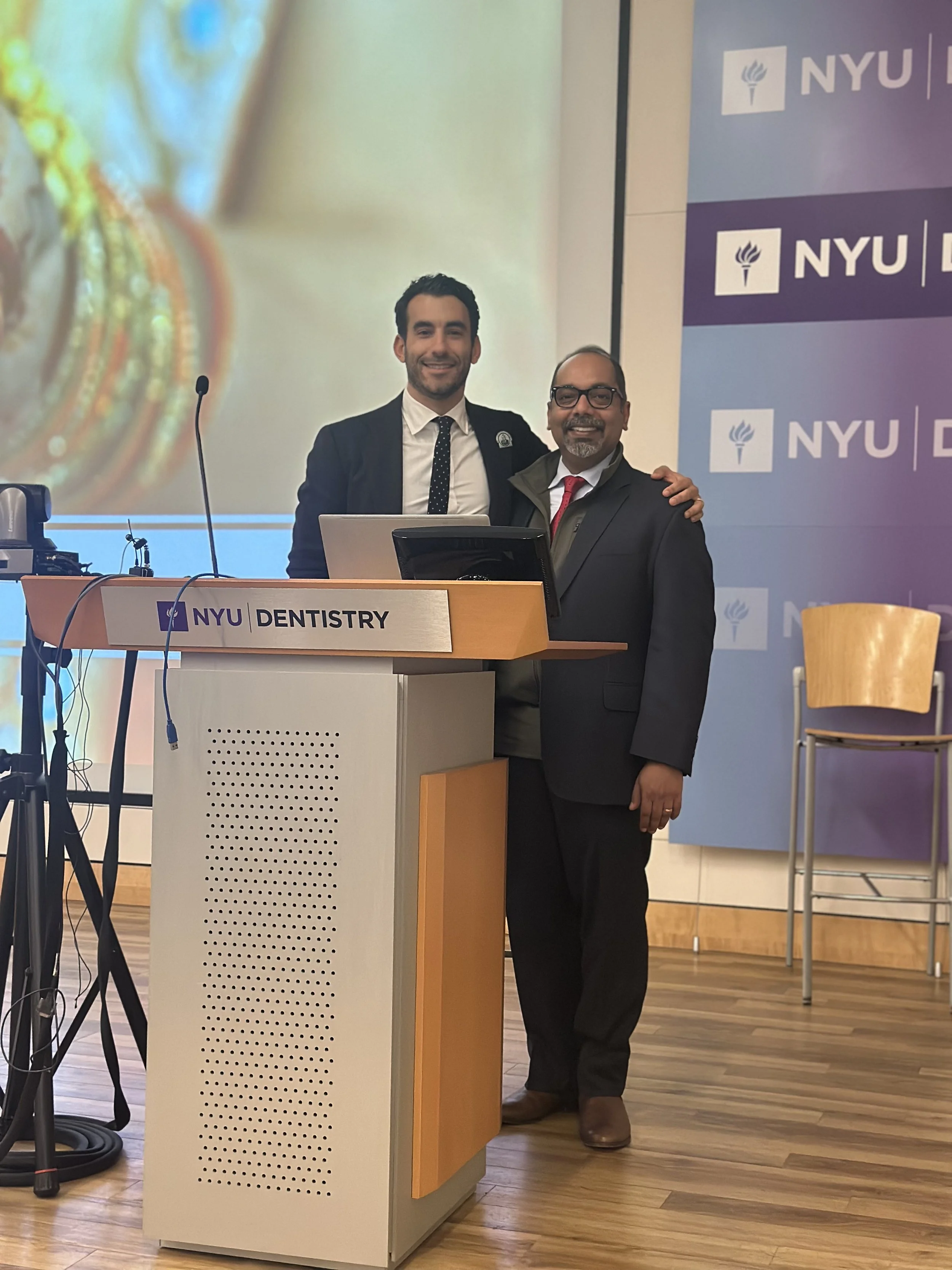 Two men smiling at a podium with NYU Dentistry signage, standing in a lecture hall or conference room.