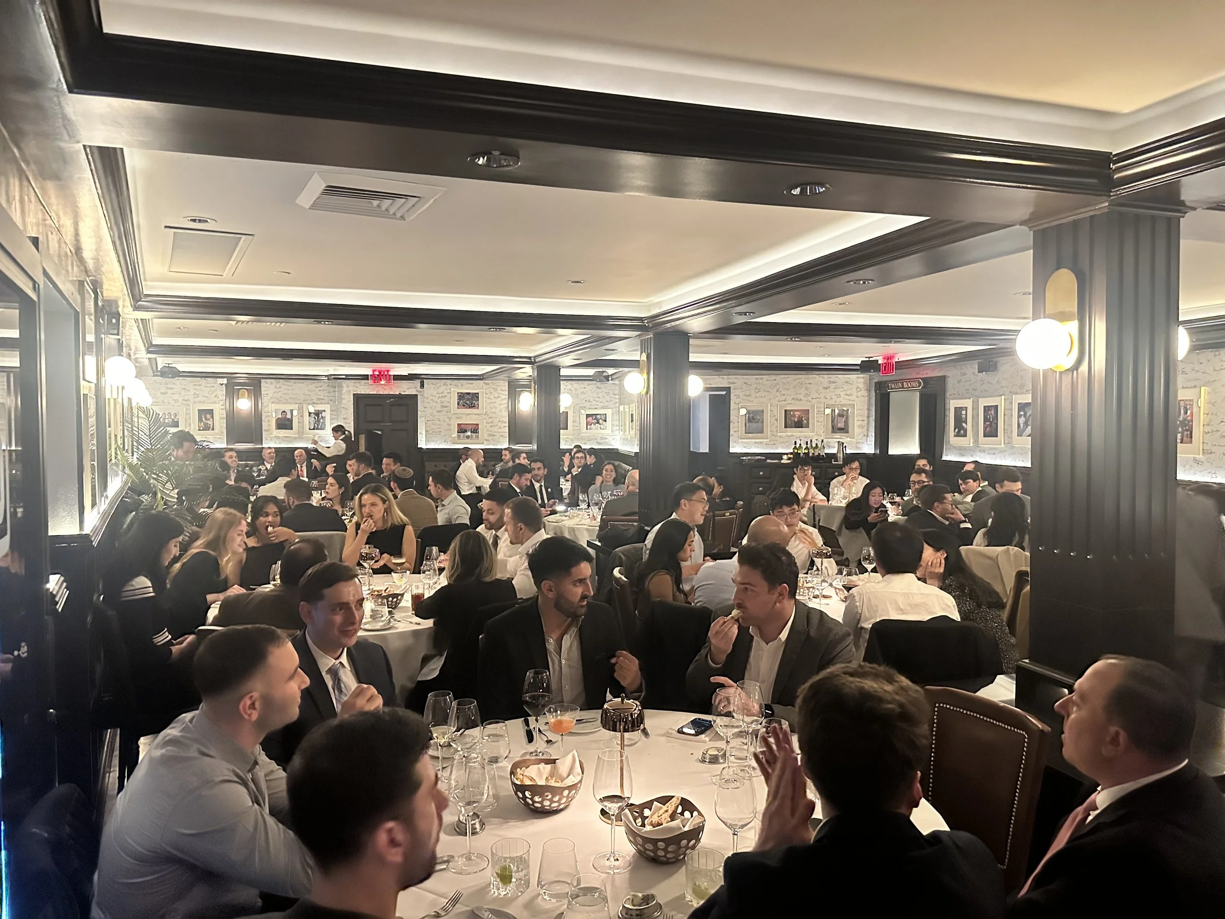 Group of people sitting around a table at a formal dinner in a restaurant, smiling at the camera.