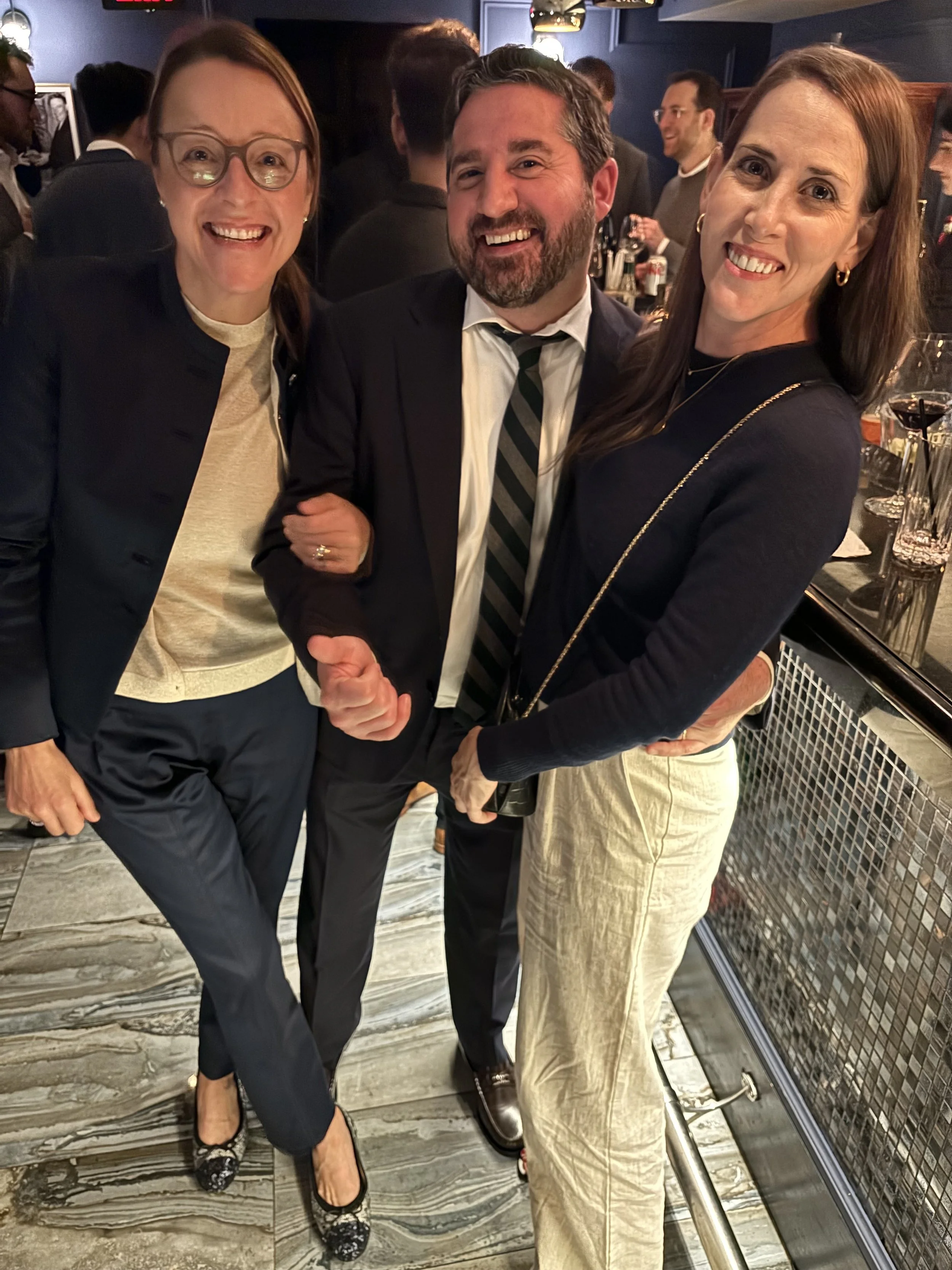 Three people smiling and posing together at a social event, standing close to the bar with drinks in the background.